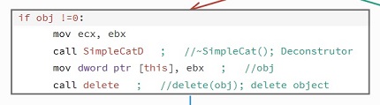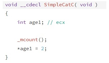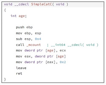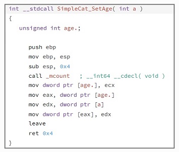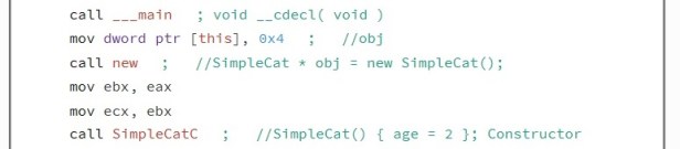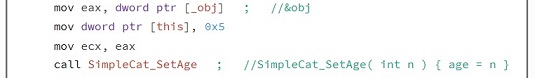 The simplecat function is the first function to be called by default, it has the same name of the Class. When on object (instance of a class) is created, it initializes values to the data members of the object. When looking at this function in assembly, it looks to be a simple function which declares age to be equal to two, we can simplify this by converting to pseudo code.