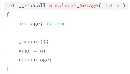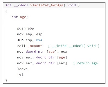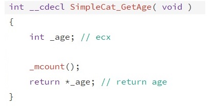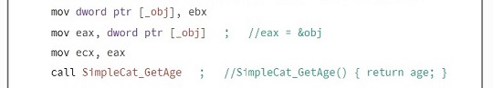 The simpleCat_GetAge function simply returns the value passed to it. In the assembly ecx holds the objects value, in this case its and integer, passed into a local variable called age. The value is passed into eax, returning that value when the function is called.