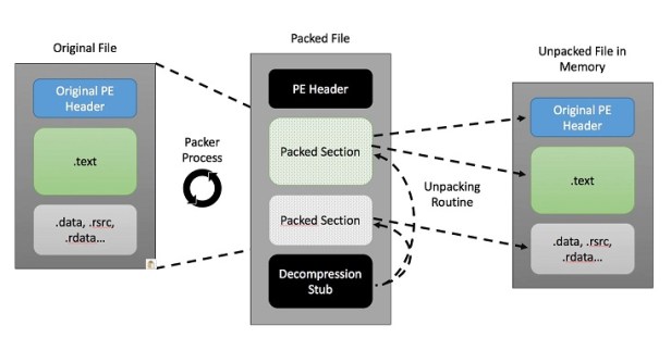 - When an executable is packed an encoded version of the malware can be stored in a variable, possibly encoded with a key. At execution time, the program generates a key and decodes the malware. The malware is loaded into memory, the program is unpacked and then jumps to the address and executes the malicious payload.