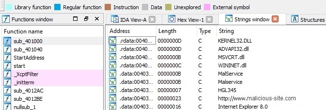 Looking at the unpacked file in IDA Pro we can see more functions, plus more strings are available. We can see from the strings this file is indeed malware.