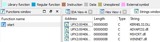 There is only one function available, the start function and the strings show the most common used API strings. You can also spot under Address this file is packed with UPX.