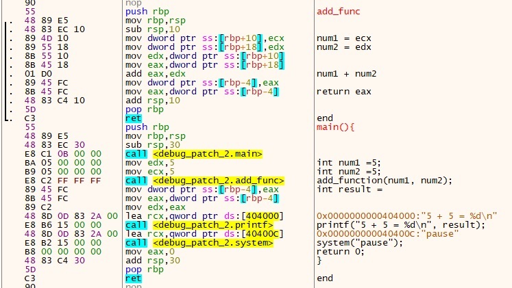 This post is an introduction on how to patch an executable in x64dbg. Patching is changing or modifying the assembly instructions to improve the executable, fix problems or modify it to do something differently. This is a simple C program to add two numbers in a function and print out the result. Here is the assembly code for this program: