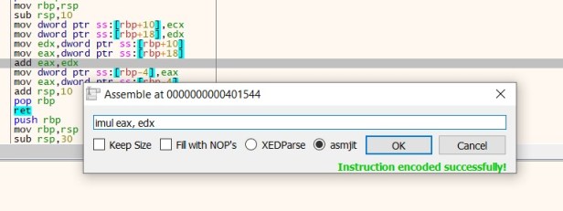 The first patch I want to make is rather than add too variables in the function we multiply and return the new value to the printf statement. This is a fairly simple operations as all I have to do is change the add instruction to a multiple instruction, which in assemble its imul.