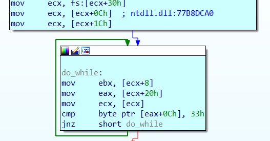 The first function it has to find is GetProcAddress, which it does by using a do while loop