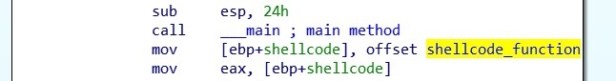 I have converted this variable pointer into a function and called it shellcode function. We can see from the below assembly this shellcode function is moved into a variable pointer which I call shellcode.