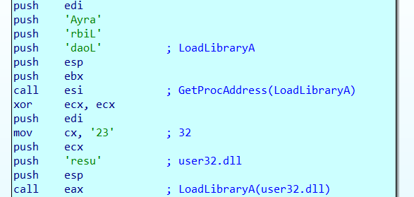 The shellcode needs to get a handle for LoadLibraryA using GetProcAddress. Then next stage is to get a handle to user32.dll using LoadLibraryA.