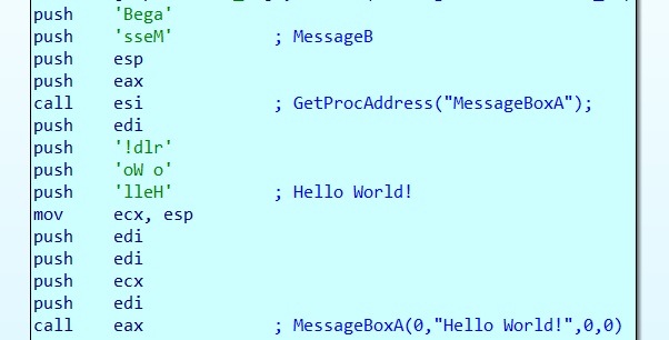 This post is an introduction how shellcode works at the assembly level. I found a simple sample of shellcode on the Internet, which all it did was display a message box displaying “Hello World!” to screen, it also prints out the string length of the shellcode,