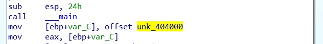 When we load the program into IDA PRO and open the main function, we see an unknown pointer to a location in memory. When we look at this more closely we see it’s an unreadable hex string, we can convert this into data to see the assembly code more clearly.
