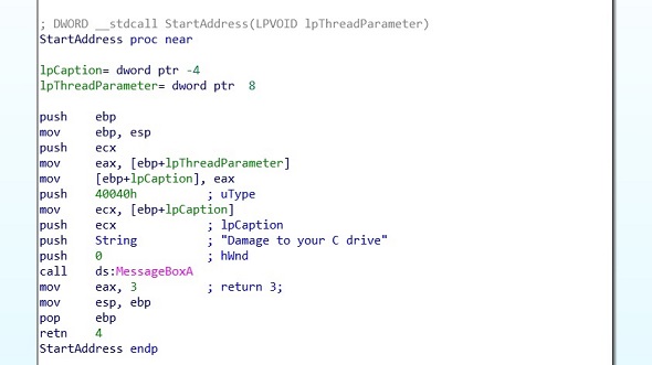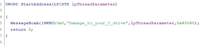I open this exe file in IDA Pro and look at the three main functions. I quickly determine this file creates a thread which creates another thread. We will start analyzing the Startaddress function, this seems to do little more than product a Messagebox displaying “Damage to your C drive”.
