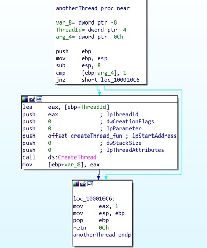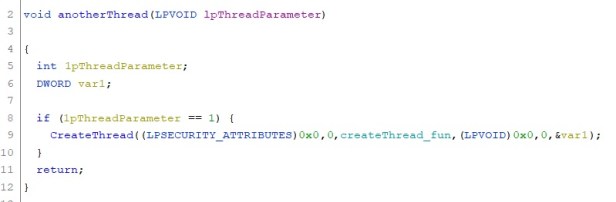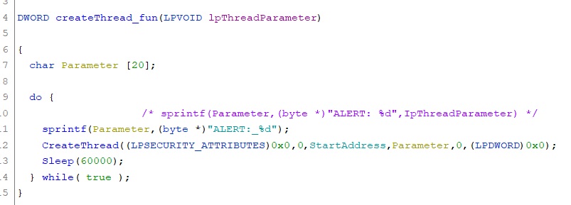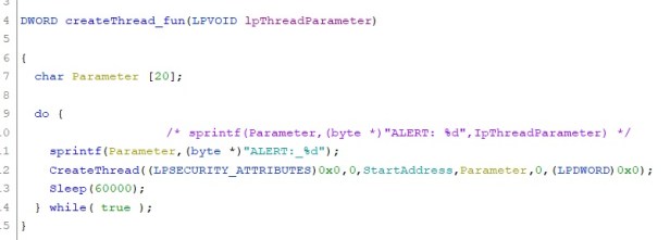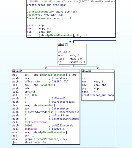 This function is a loop that creates a thread every minute. This thread activates the StartAddress function which will produce the messagebox. We can also see a parameter for the title of the messagebox which is set by the sprintf function. This parameter is the format string “ALERT: %d”, where %d is replaced with a counter that increments every time the messagebox is displayed.