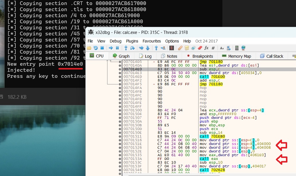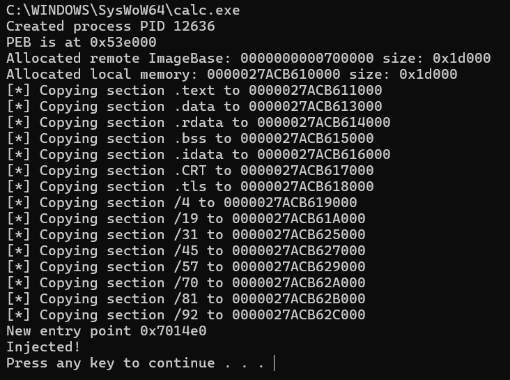 Im going to use a process hollowing tool to inject the code, this tool will tell me what process will be used, process PID, ImageBase (start of the exe file ) address, size, allocated memory, where each section is injected too and the entry point (where code execution starts).