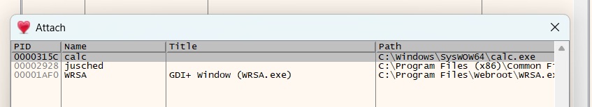 I launch my x32dbg application and go to File – Attach to view current running processes. I see the calc.exe process is running.