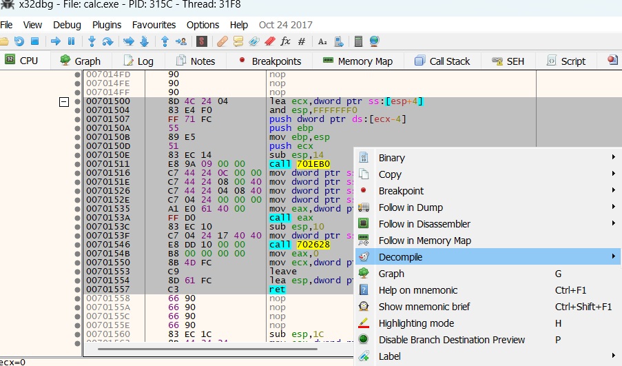 I select the assembly code and decompile it, making it a more understandable in the Snowman Decompiler.